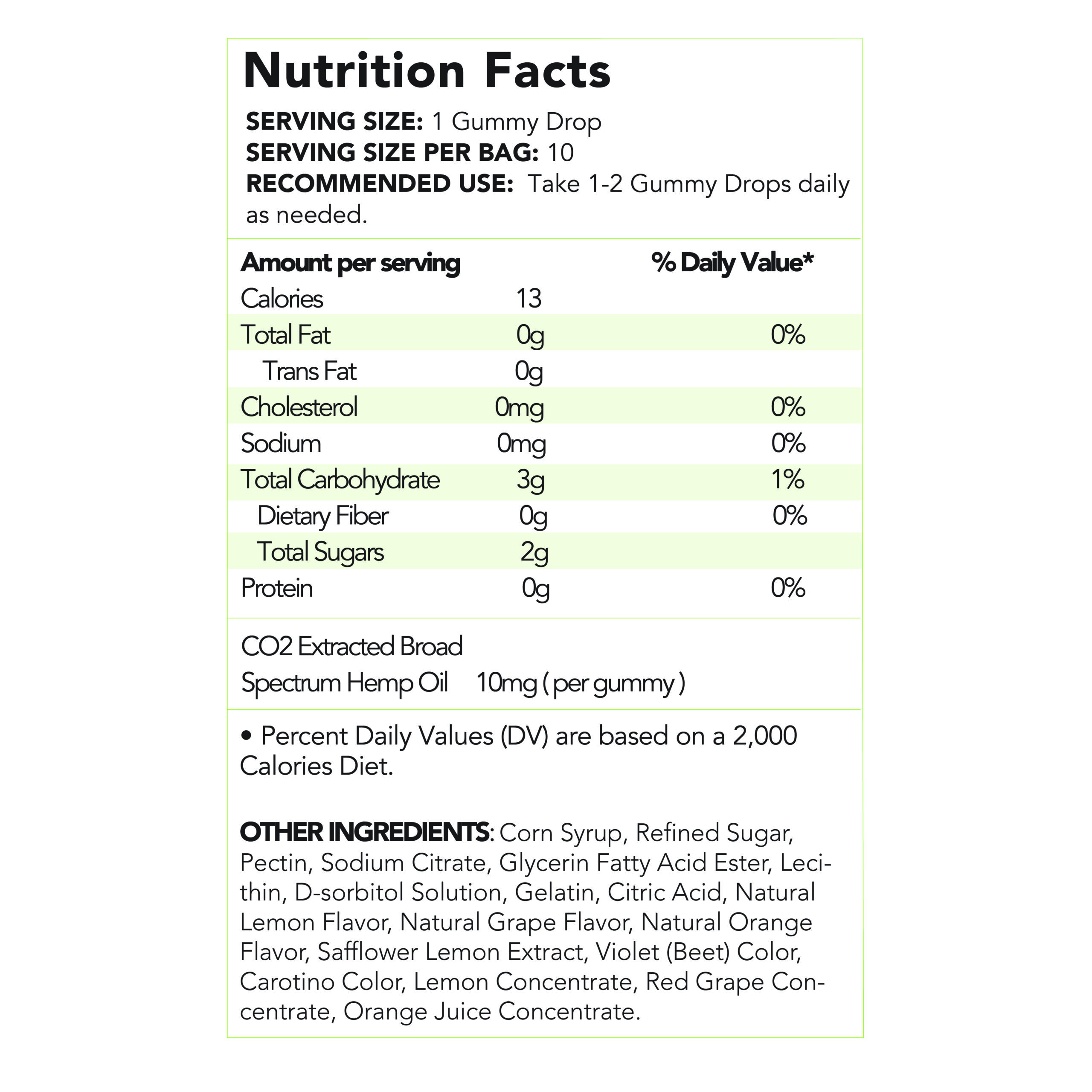 Ingredients: Corn syrup, sugar, gelatin, sorbitol, citric acid, orange juice concentrate, red grape concentrate, CO2 extracted broad spectrum hemp CBD oil, natural lemon flavoring, natural grape flavoring, natural orange flavoring, pectin, glycerin, soy lecithin, sodium citrate, natural colors