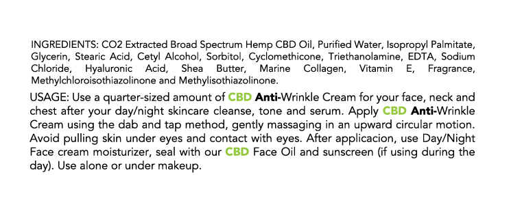 Ingredients: CO2 extracted broad spectrum hemp CBD Oil, purified water, isopropyl palmitate, glycerin, stearic acid, cetyl alcohol, sorbitol, cyclomethicone, triethanolamine, EDTA, sodium chloride, hyaluronic acid, shea butter, marine collagen, vitamin E, fragrance, methylchloroisothiazolinone and methylisothiazolinone.