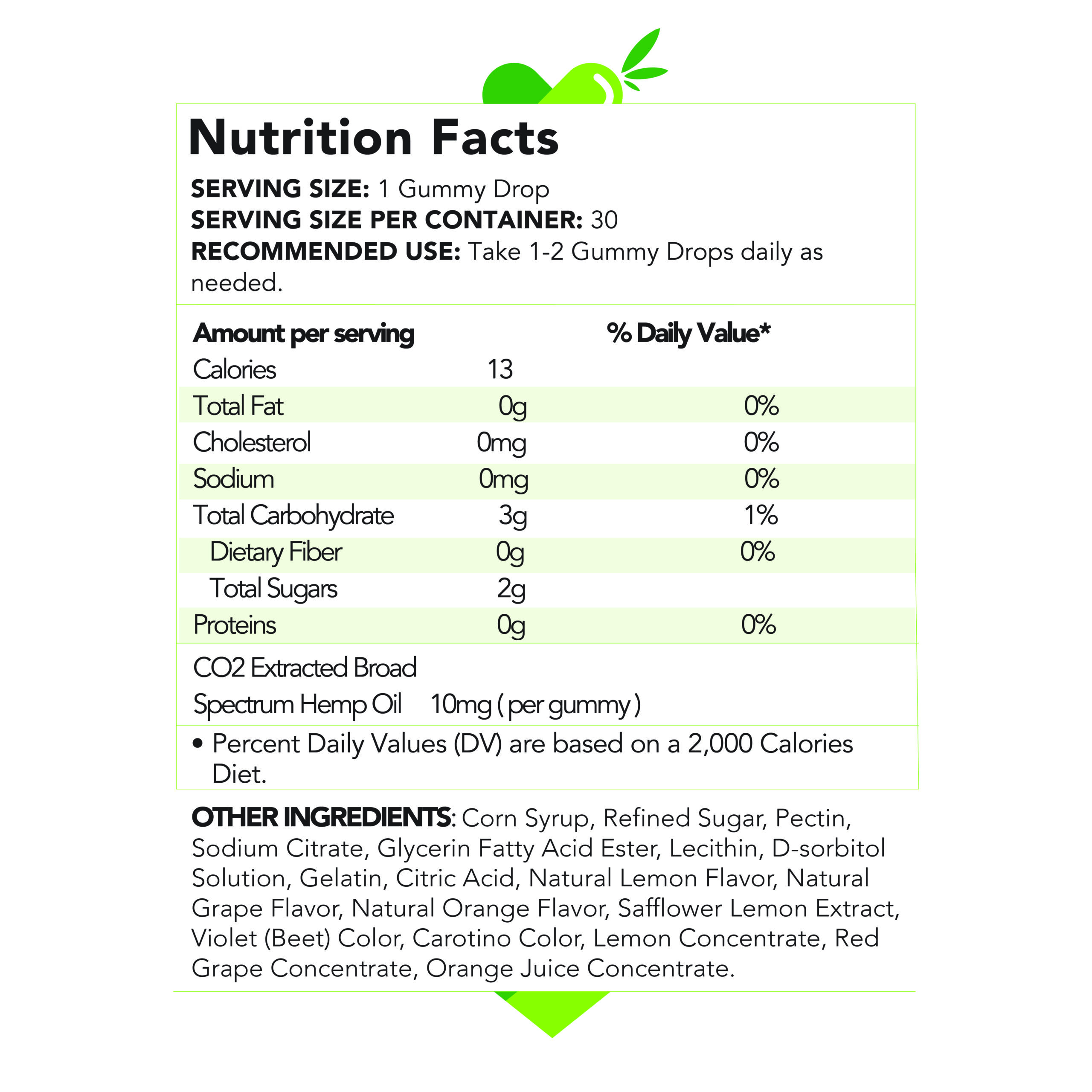 Ingredients: Corn syrup, sugar, gelatin, sorbitol, citric acid, orange juice concentrate, red grape concentrate, CO2 extracted broad spectrum hemp CBD oil, natural lemon flavoring, natural grape flavoring, natural orange flavoring, pectin, glycerin, soy lecithin, sodium citrate, natural colors