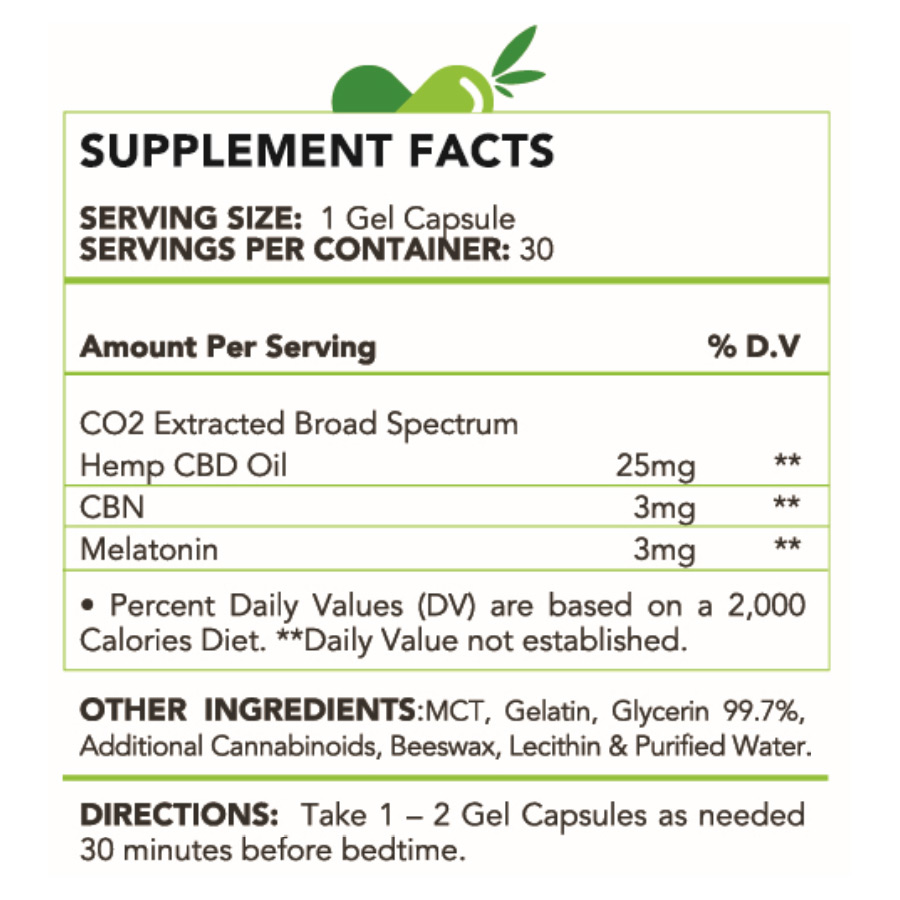 CO2 Extracted Broad Spectrum Hemp CBD Oil, CBN, Melatonin, MCT, Gelatin, Glycerin 99.7%, Additional Cannabinoids, Beeswax, Lecithin & Purified Water.